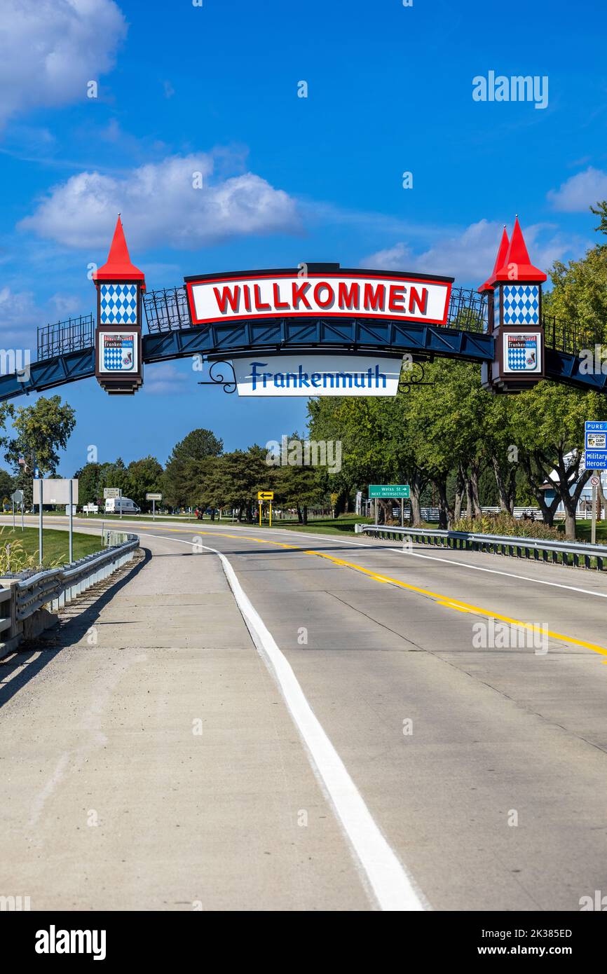 Das Frankenmuth Welcome Sign Michigan USA über die Main Road in die