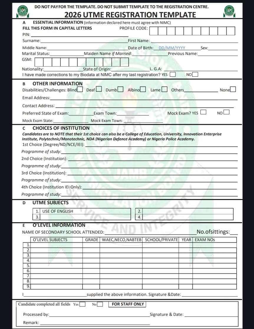 Download JAMB 2026 Free Registration Template (PDF File)