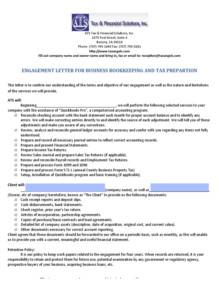 Engagement Letter For Business Bookkeeping and Tax Download Free PDF