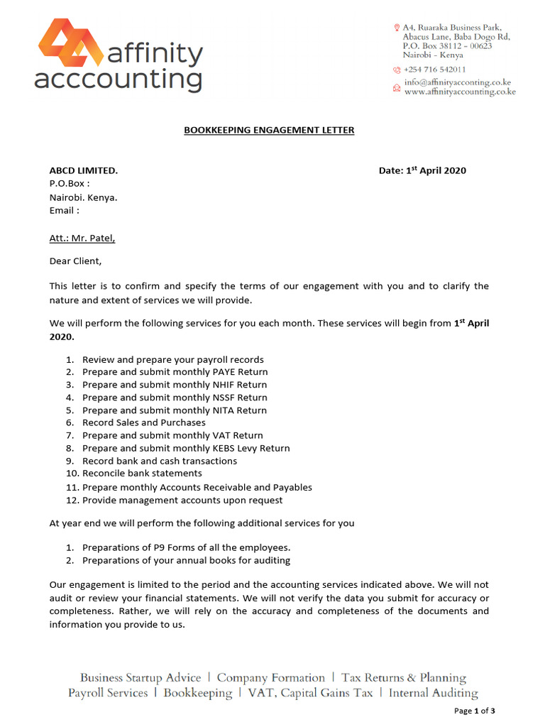 Bookkeeping Engagement Letter ABCD Limited Download Free PDF