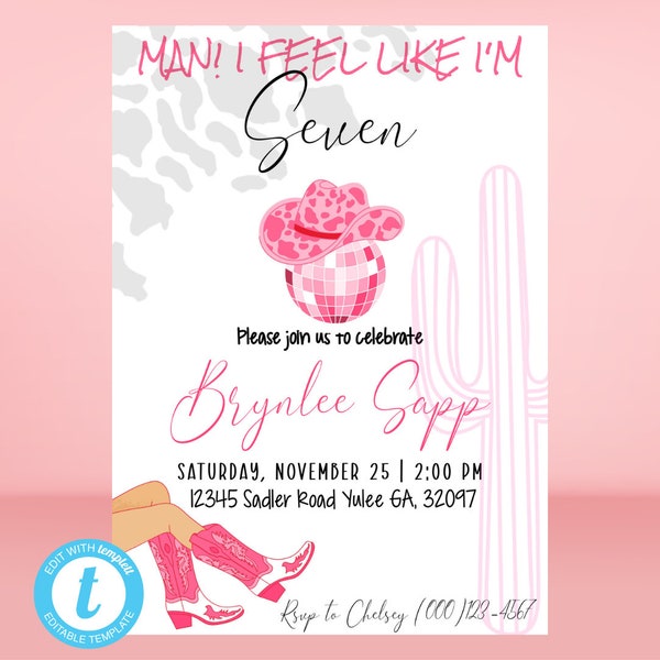 Disco Pink Cowgirl Birthday Invitation Template Editable Printable
