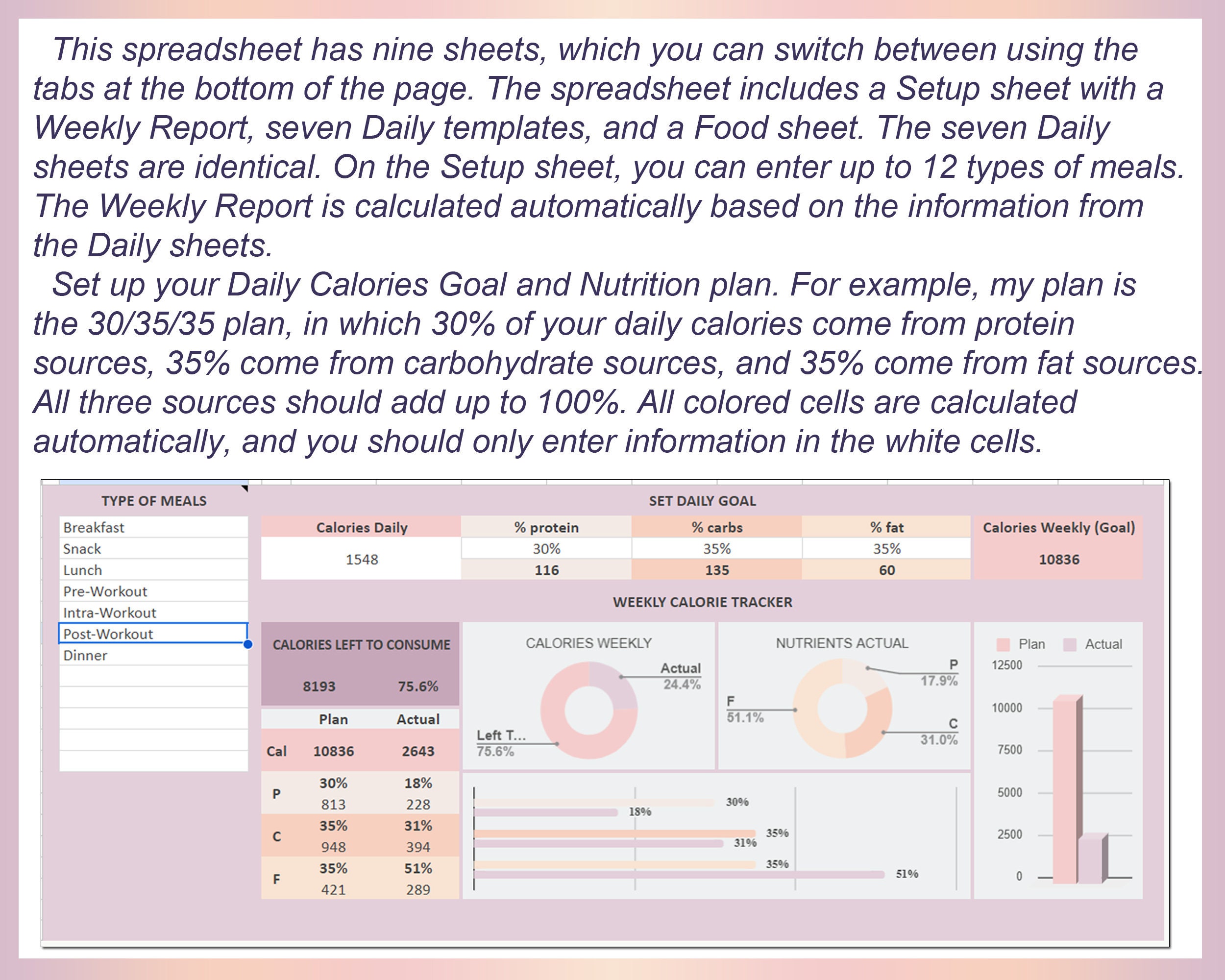 Macro Meal Planner for Excel and Googlesheets Fully Editable Weekly