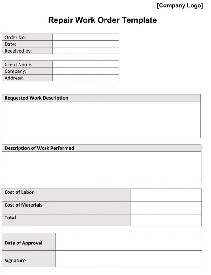 Repair work order template in Word and Pdf formats