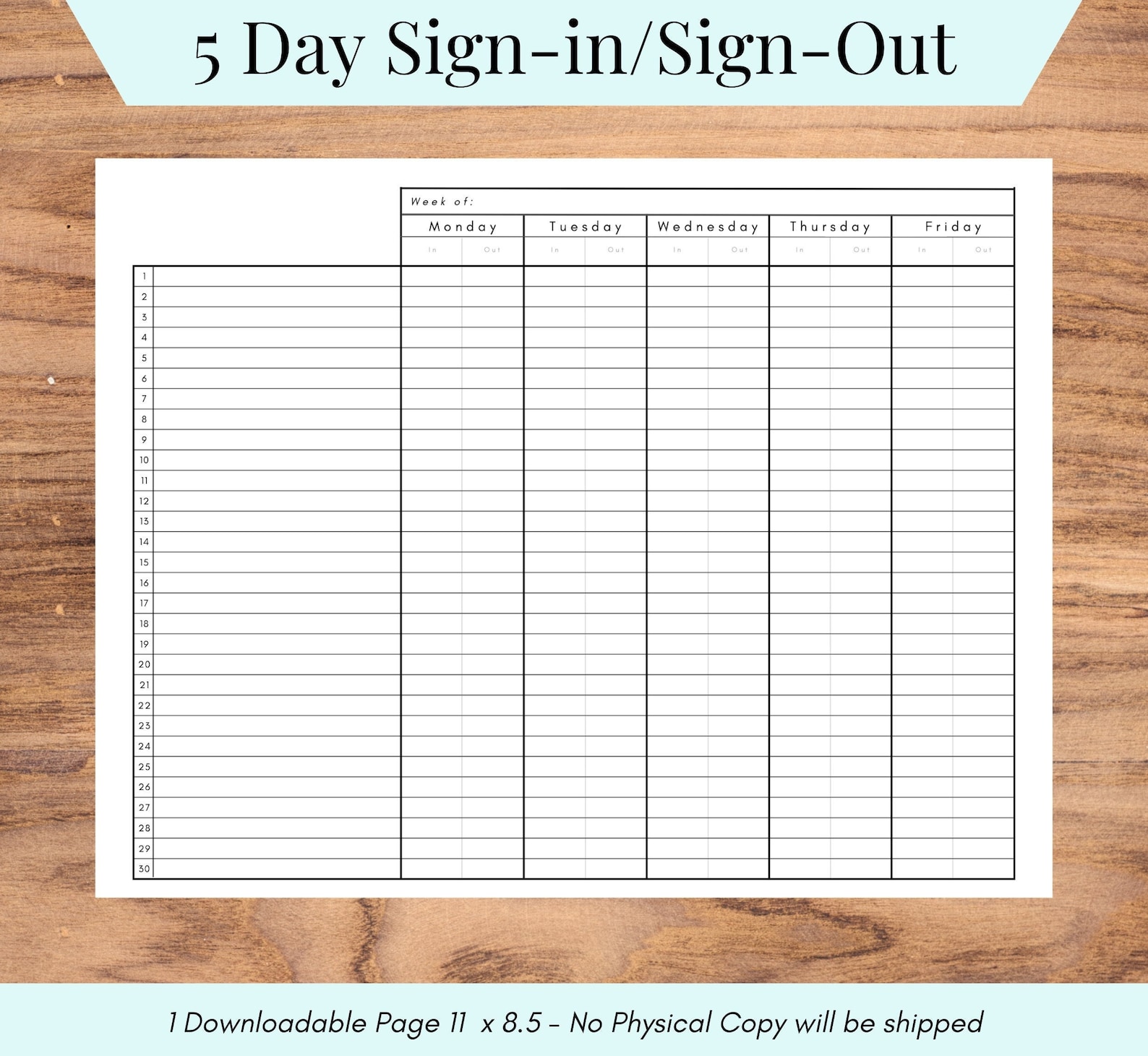 Mon fri Sign in Template Printable Sign in and Sign out Sheet Weekly
