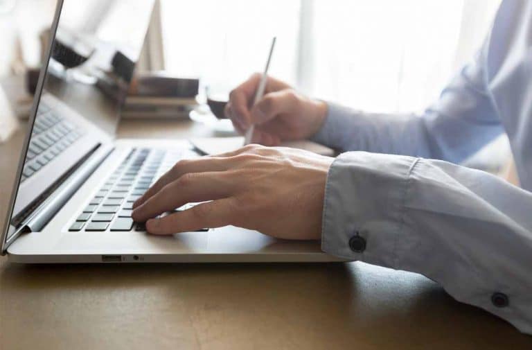 Premium Photo Laptop reading and professional woman writing summary