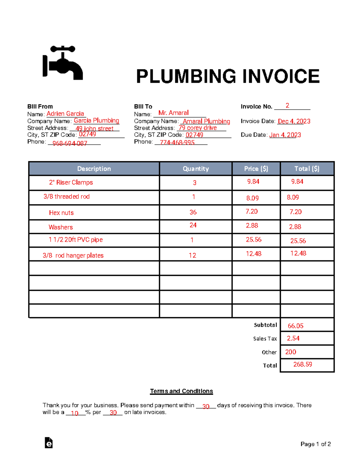 Plumbing Invoice Template 8 Free Word Excel PDF Format Download