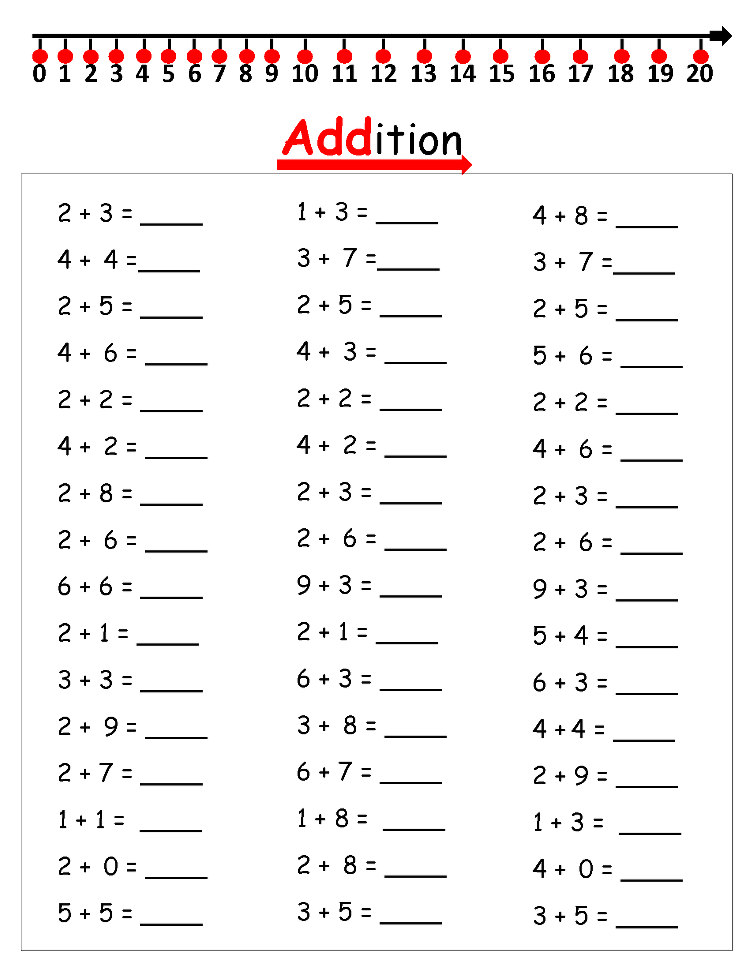 Free 1 Digit Addition Worksheet Kindergarten and First Grade Math