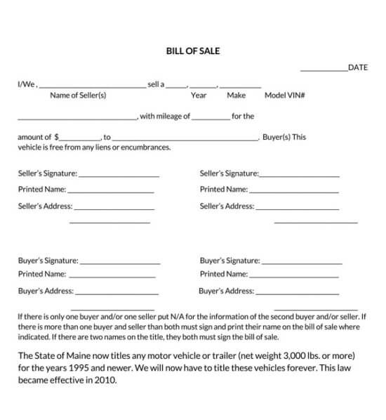 Car Bill of Sale for Maine Free Forms (Word PDF)