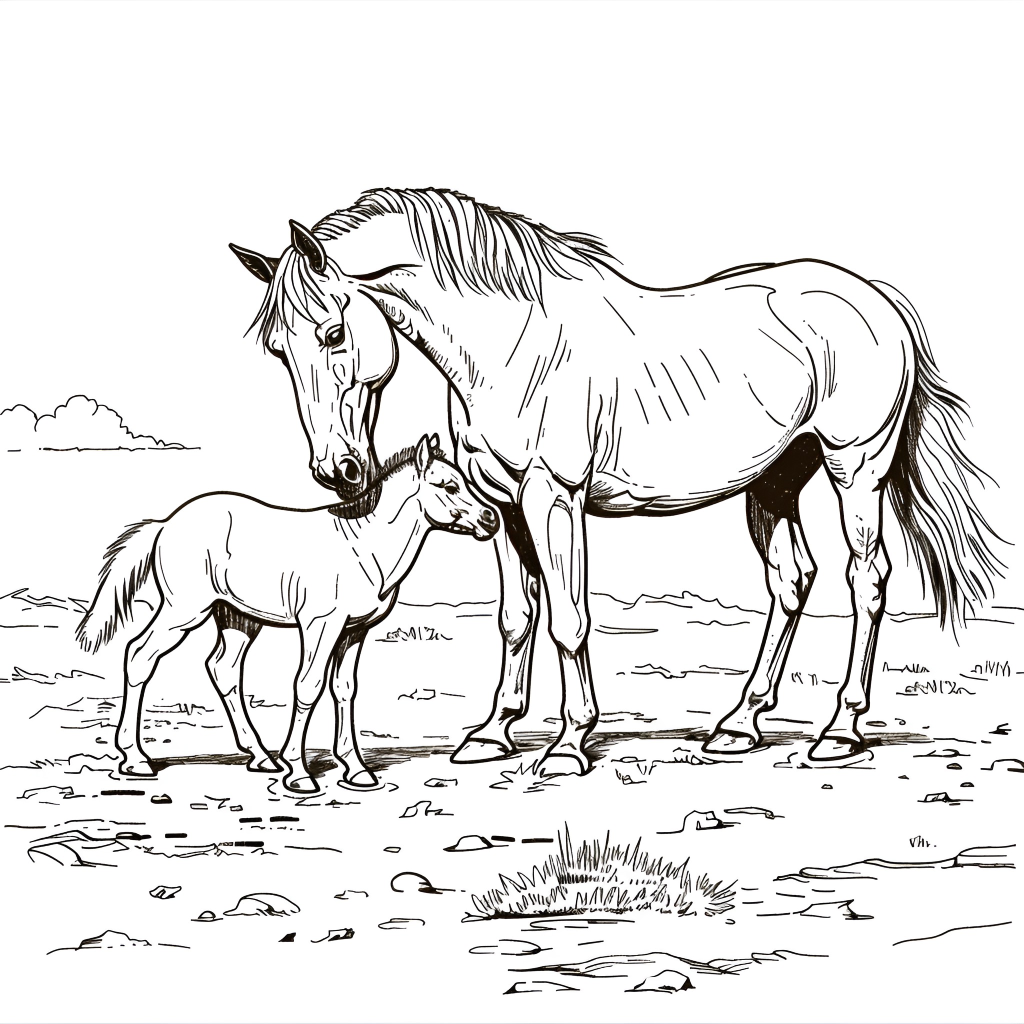 Printable Coloring Baby Horse Foal with its Mom Pages