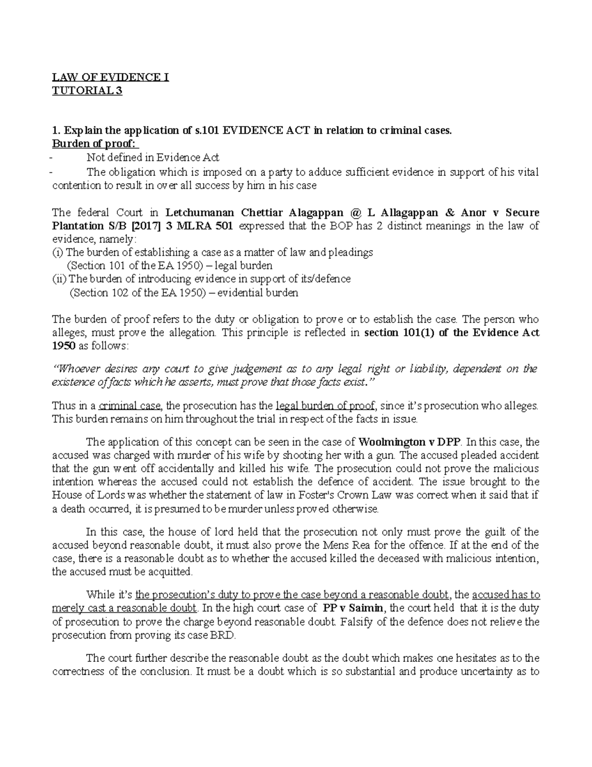 Tutorial 3 Qs LAW OF EVIDENCE I TUTORIAL 3 1 Explain the application