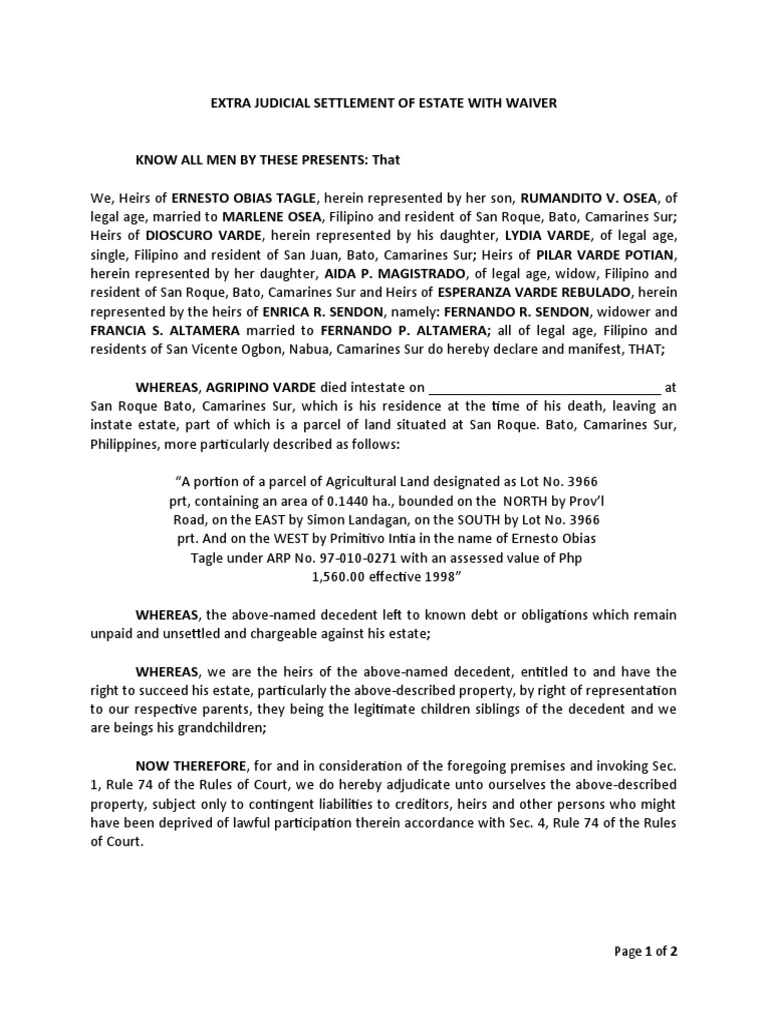 Extrajudicial Settlement of Estate With Waiver PDF Government