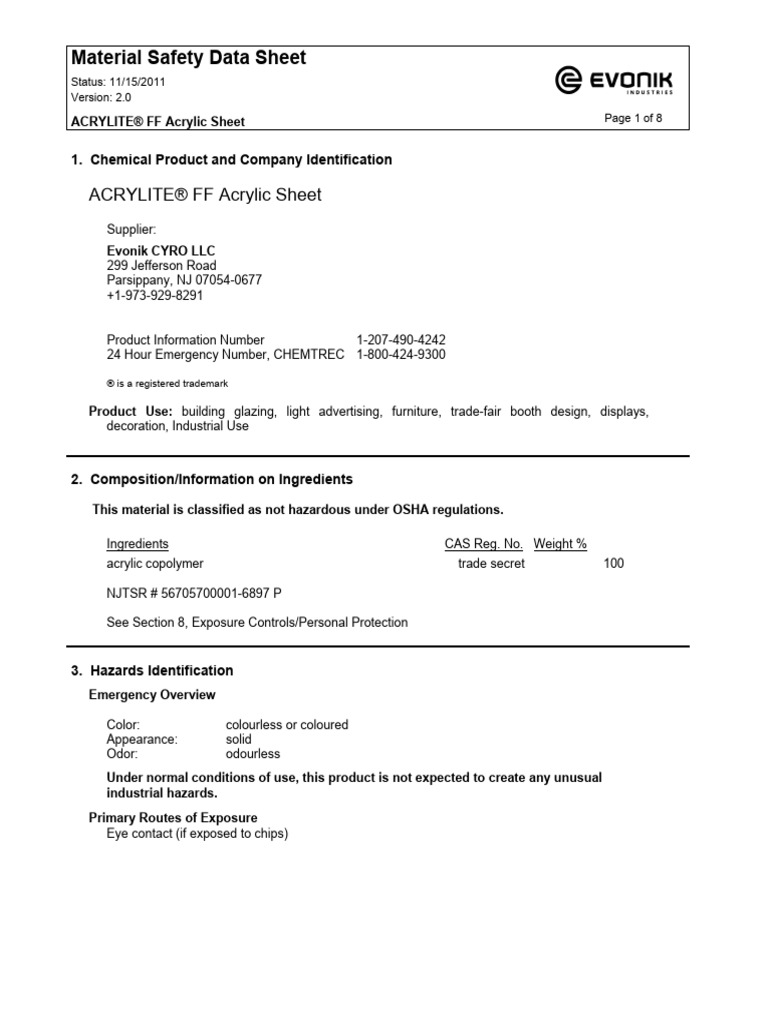 AcryliteFF MSDSSheet PDF Poly(Methyl Methacrylate) Personal