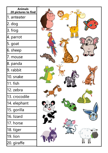 20 Animals to Find and Word Match KS1 Teaching Resources