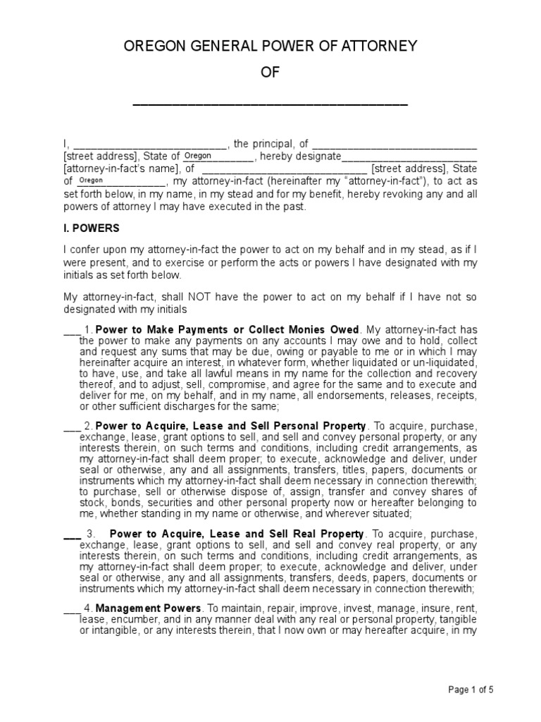 Blank Oregon General Power of Attorney PDF Template • Free Power of