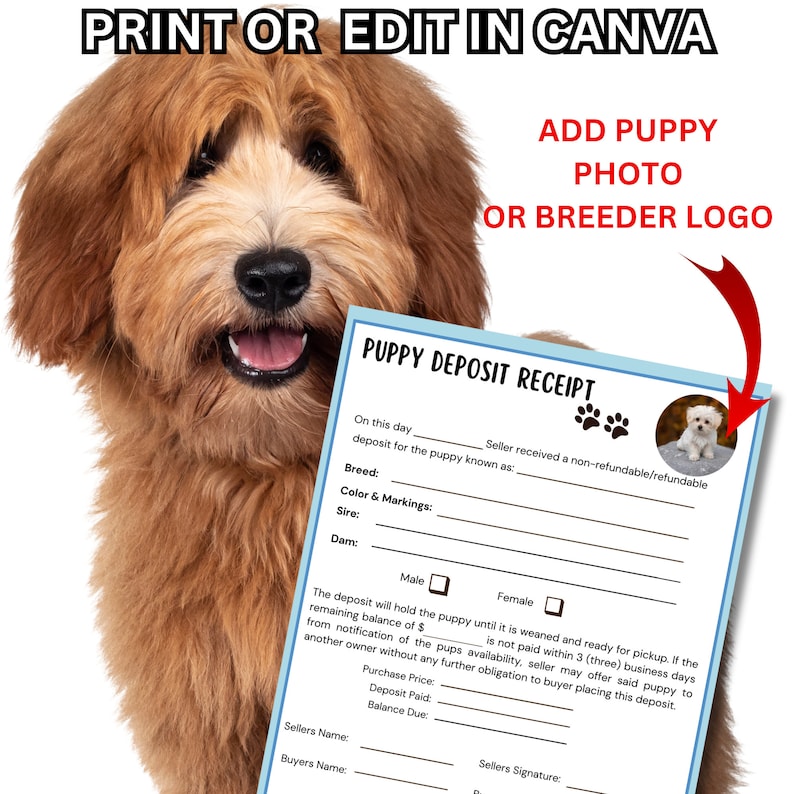 Editable Puppy Deposit Receipt Puppy Contract New Puppy Bill of Sale