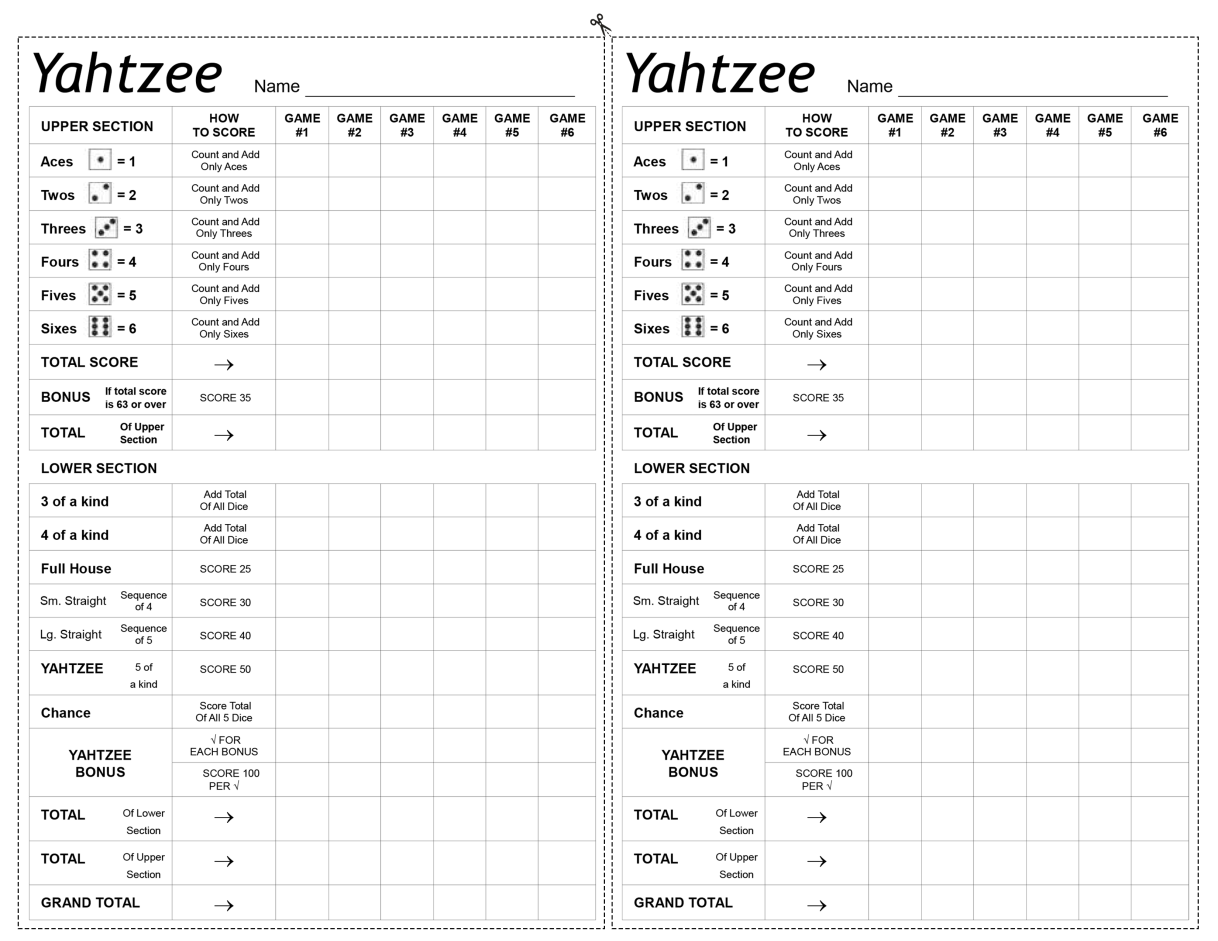 Yahtzee Score Cards Printable for Free (PDF Format) Print 1 Free