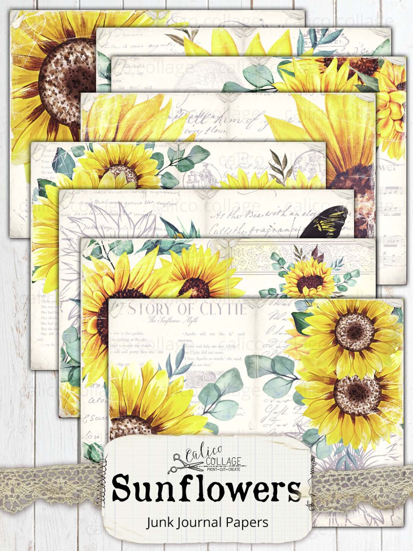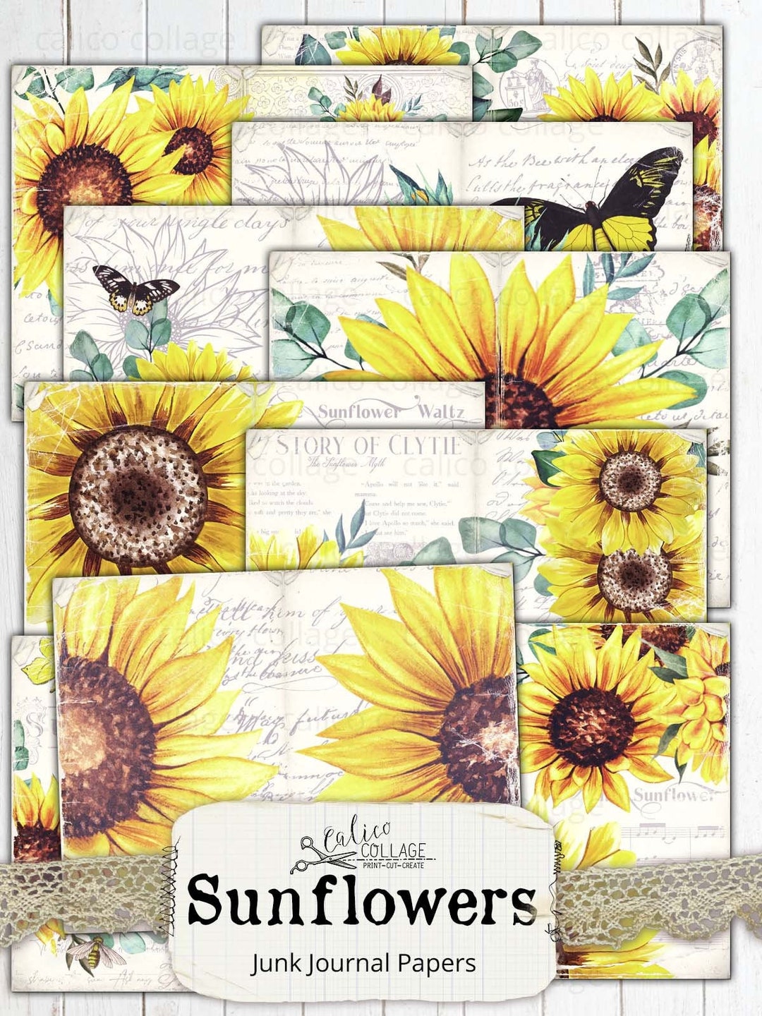 Sunflower Junk Journal Pages Printable Digital Papers Spring Floral