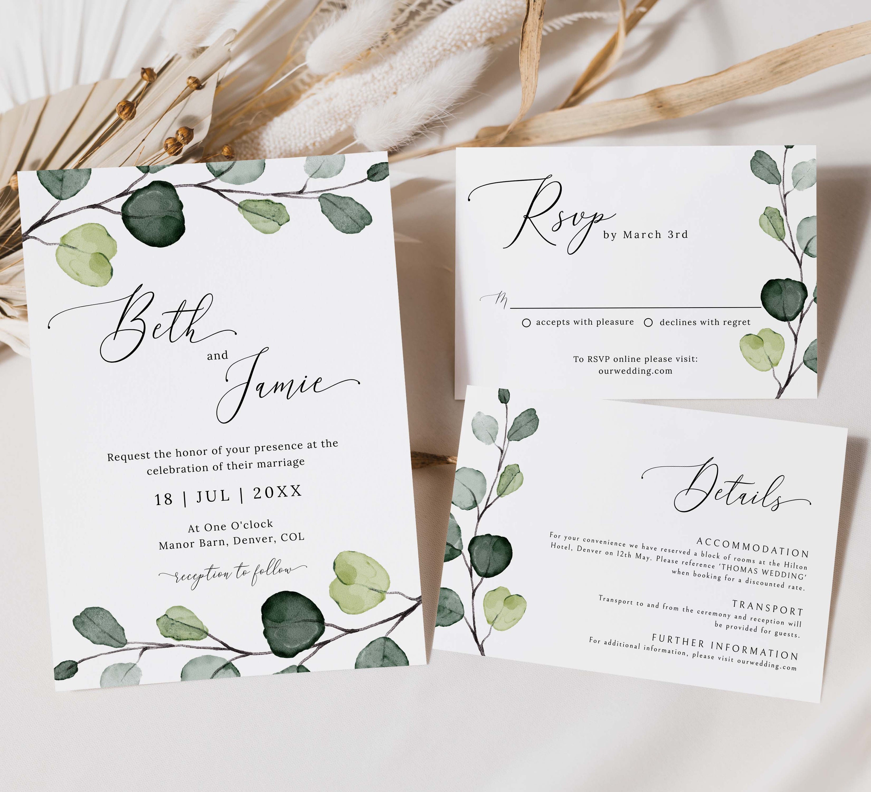 16 Minimalist Greenery Gold Eucalyptus Canva Wedding Invitation