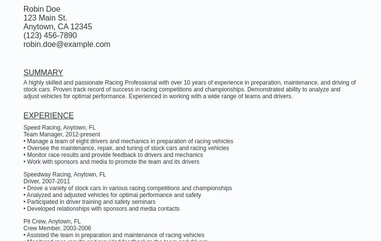 Racing Resume Sample Template (Free Download) Ziprecruiter
