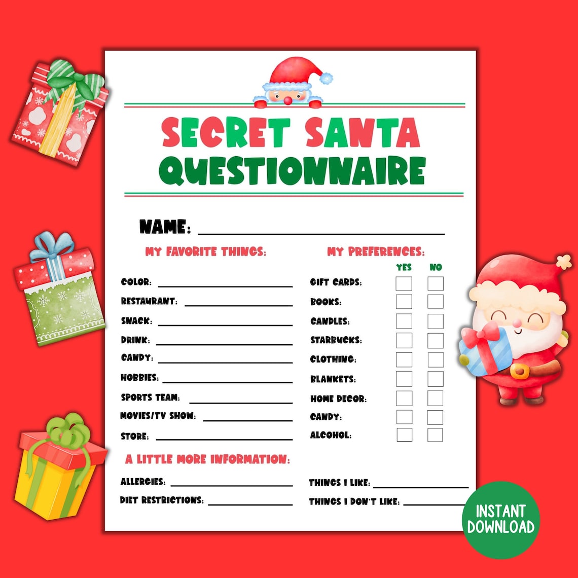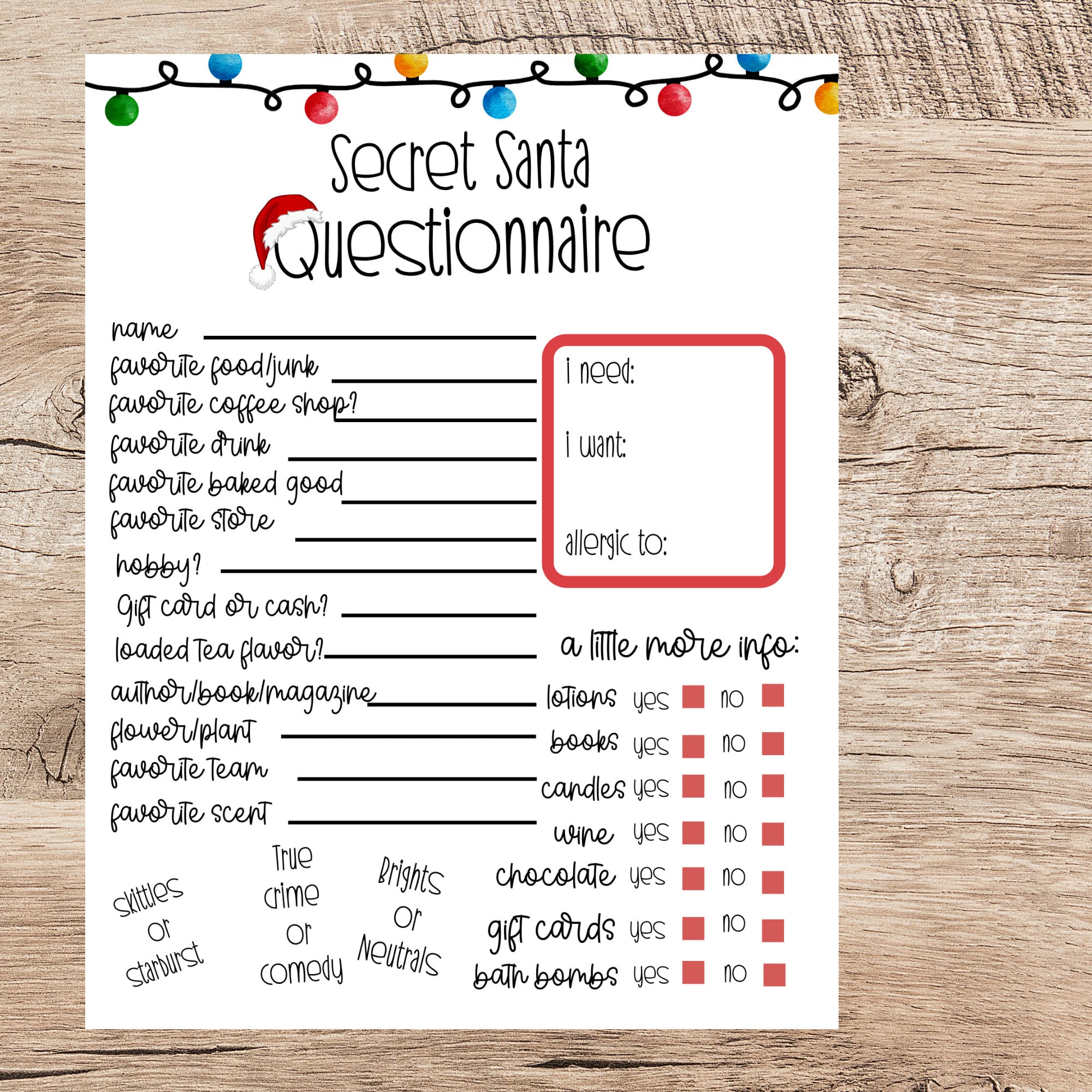 Secret Santa Questionnaire Printable Secret Santa Form Etsy