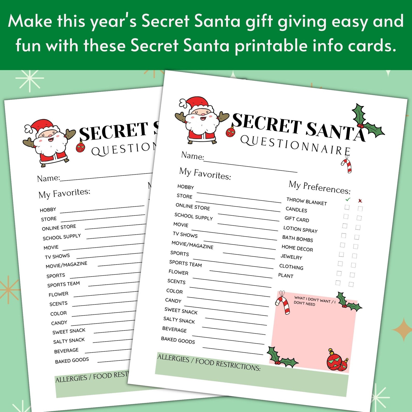 Secret Santa Questionnaire Printable Secret Santa Cards Etsy