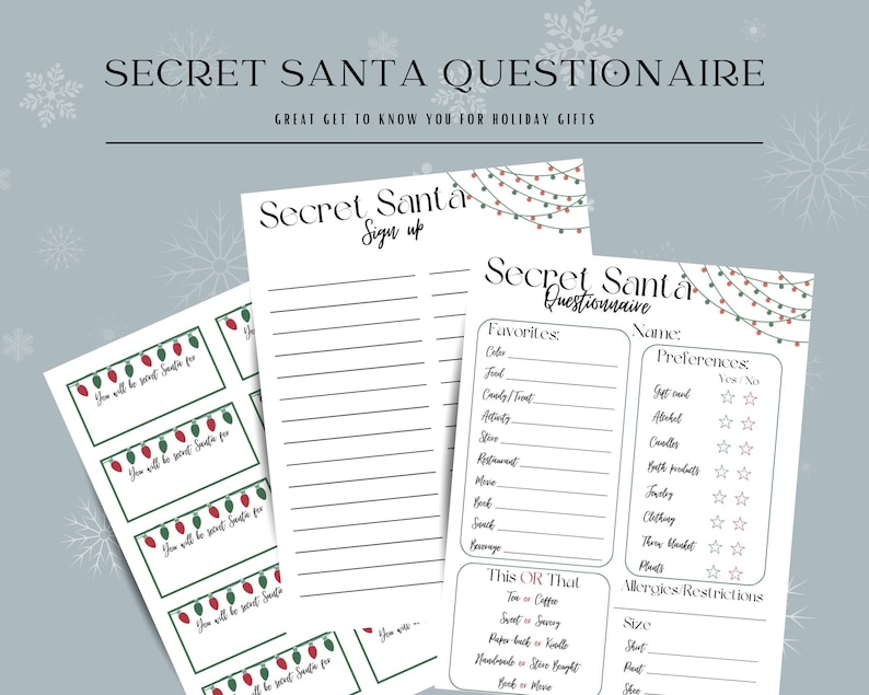 Printable Secret Santa Questionnaire Sign up and Name Cards (digital