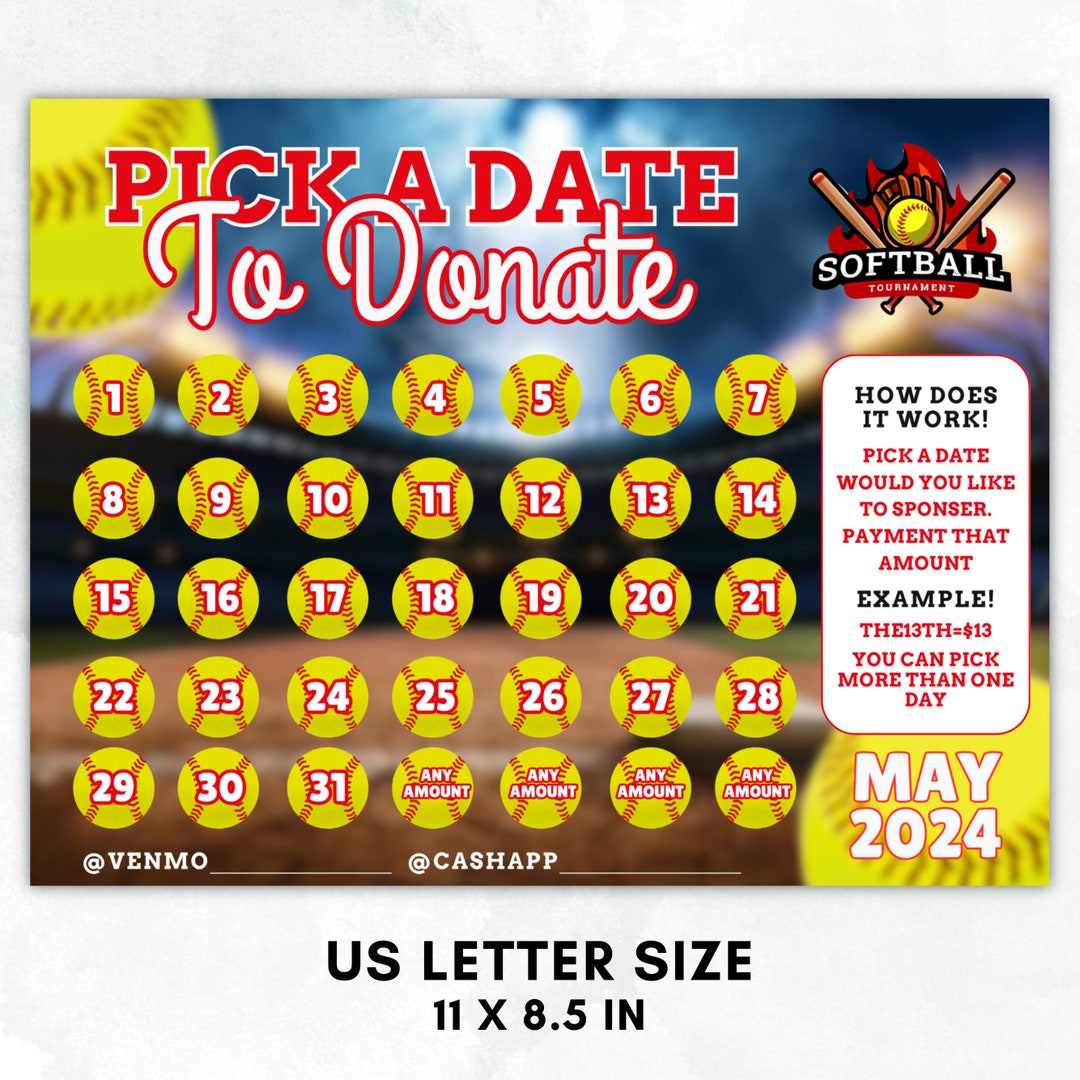 Softball Pick a Date to Donate Calendar INSTANT DOWNLOAD Fundraiser