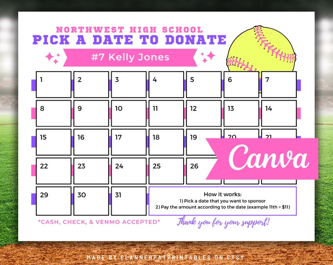 Softball Calendar Fundraiser Pick a Date to Donate Printable Etsy