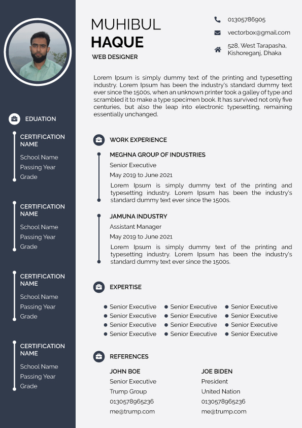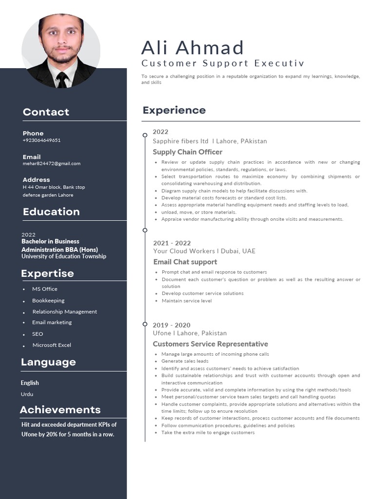 Navy Blue Minimalist CV Resume Muhammad Patel Education Expertise