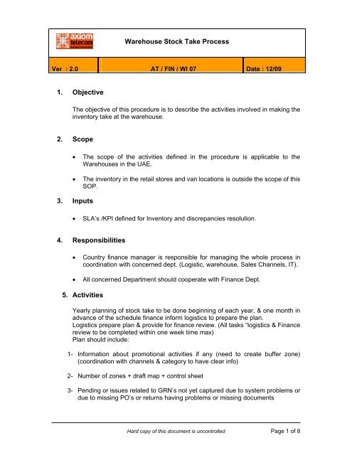 Warehouse Stock Take Process 1 Objective 2 Scope 3 Inputs 4