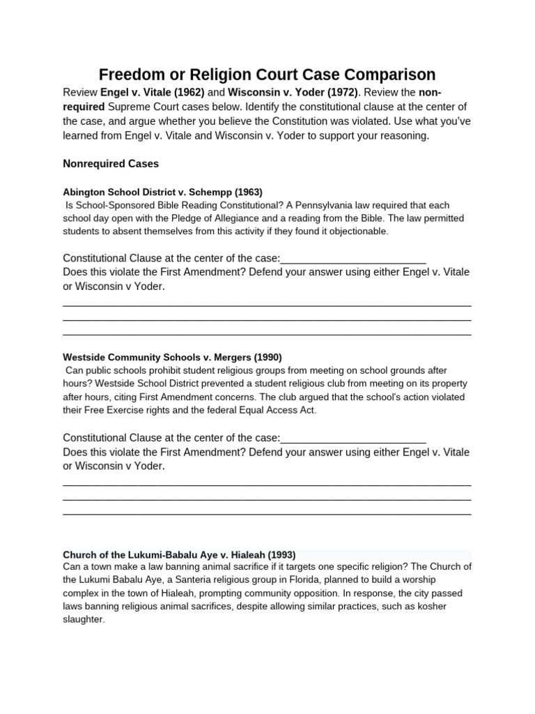 Freedom of RELIGION Court Case Analysis Cooperative Activity Print