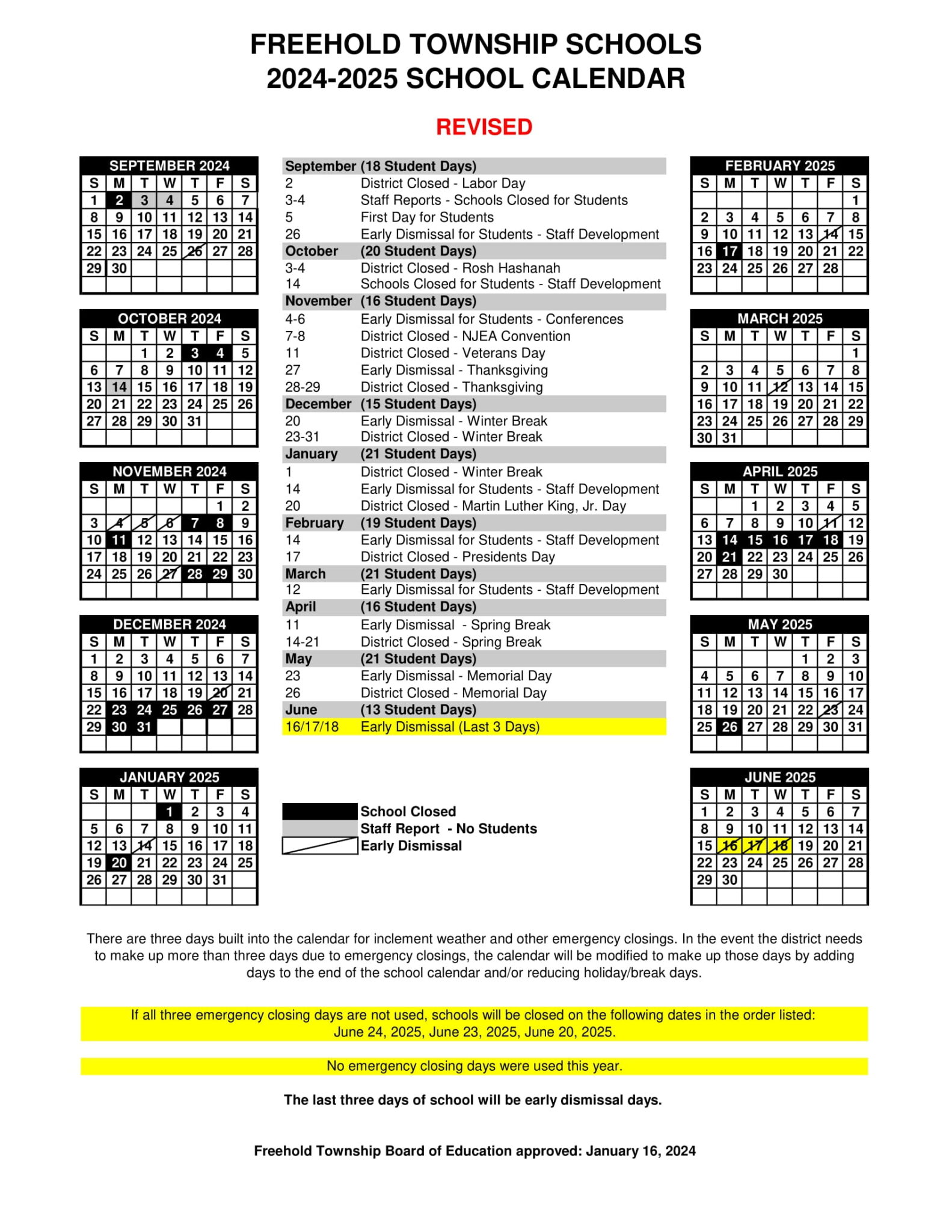 Freehold Township School District Calendar 25 26 Revised PDF EduCounty