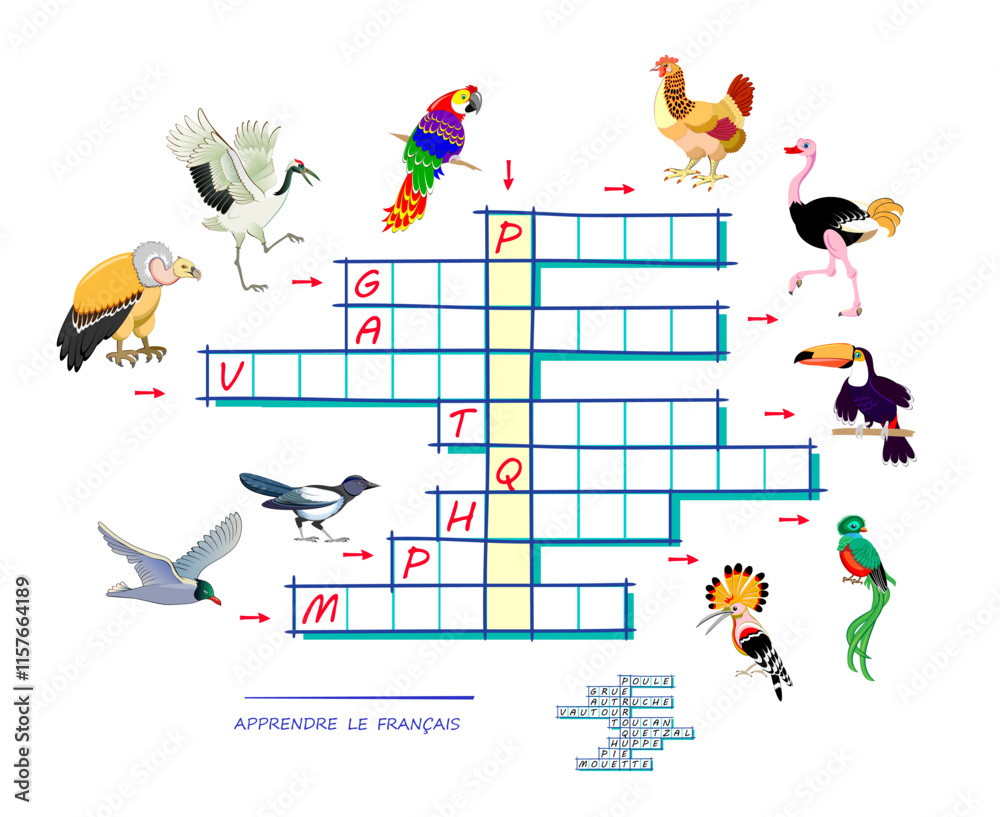 LEARN FRENCH Crossword puzzle game with pictures of birds Educational