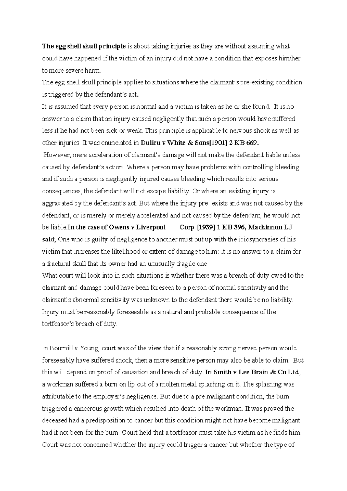 Tort law Torts of negligence The egg shell skull principle is about