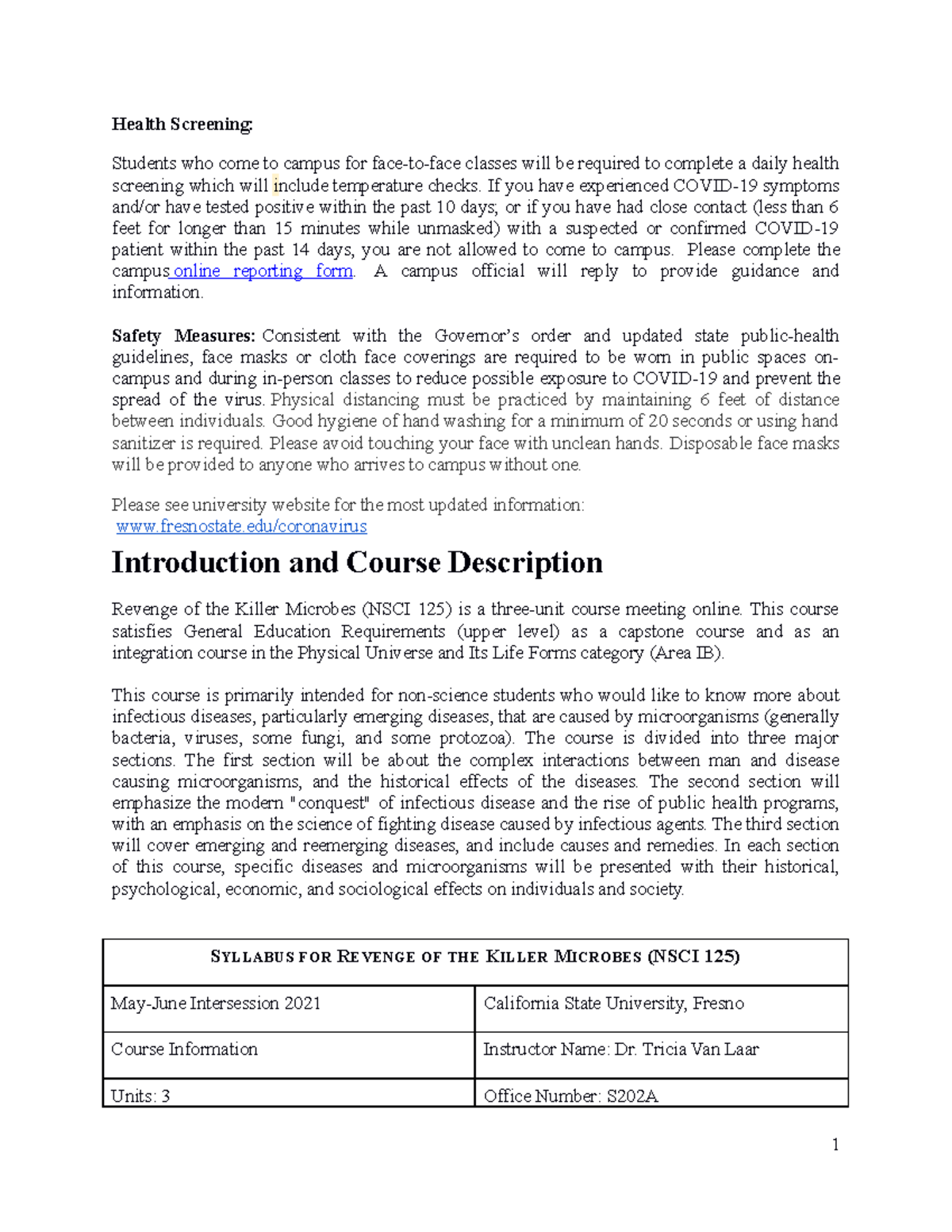 Revenge of the Killer Microbes Intersession 2021 Syllabus NSCI 125
