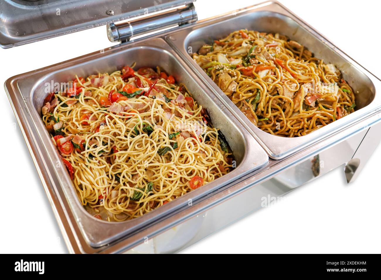 Die cut of soba noodles stir fried soy sauce in stainless steel