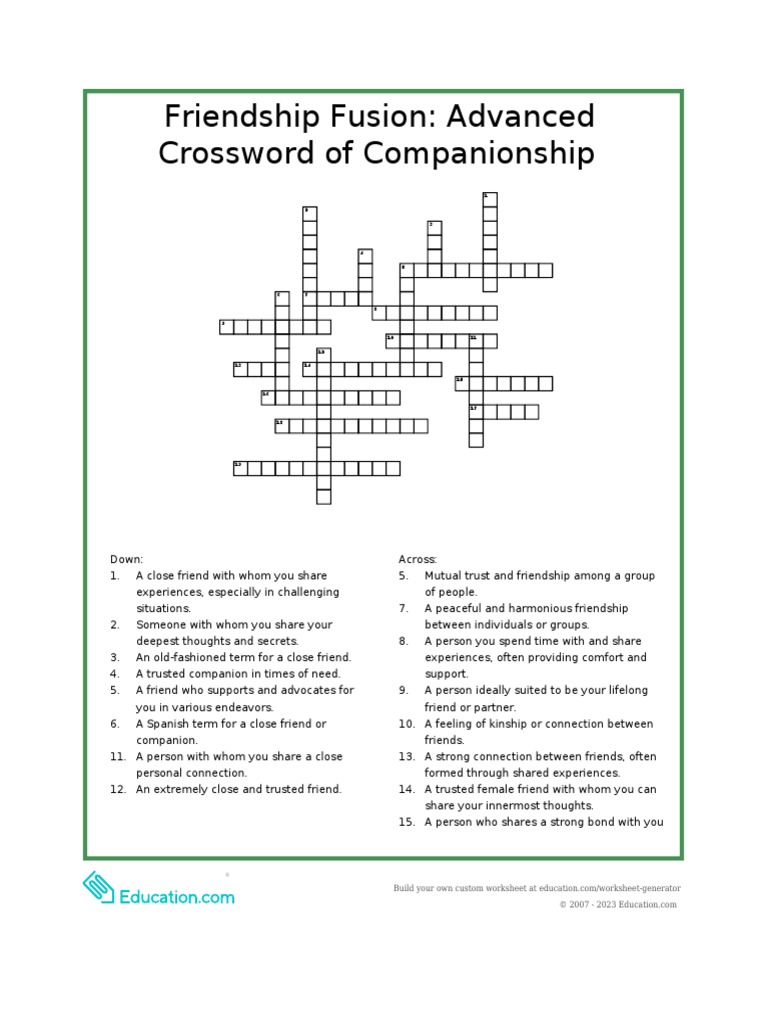 Friendship Crossword Worksheet PDF Friendship Psychological Concepts