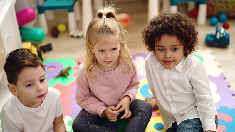 Group of Kids Sitting on Floor with Relaxed Expression at Kindergarten