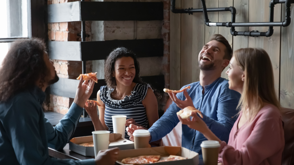 Group of friends enjoying a meal together at a cozy restaurant laughing