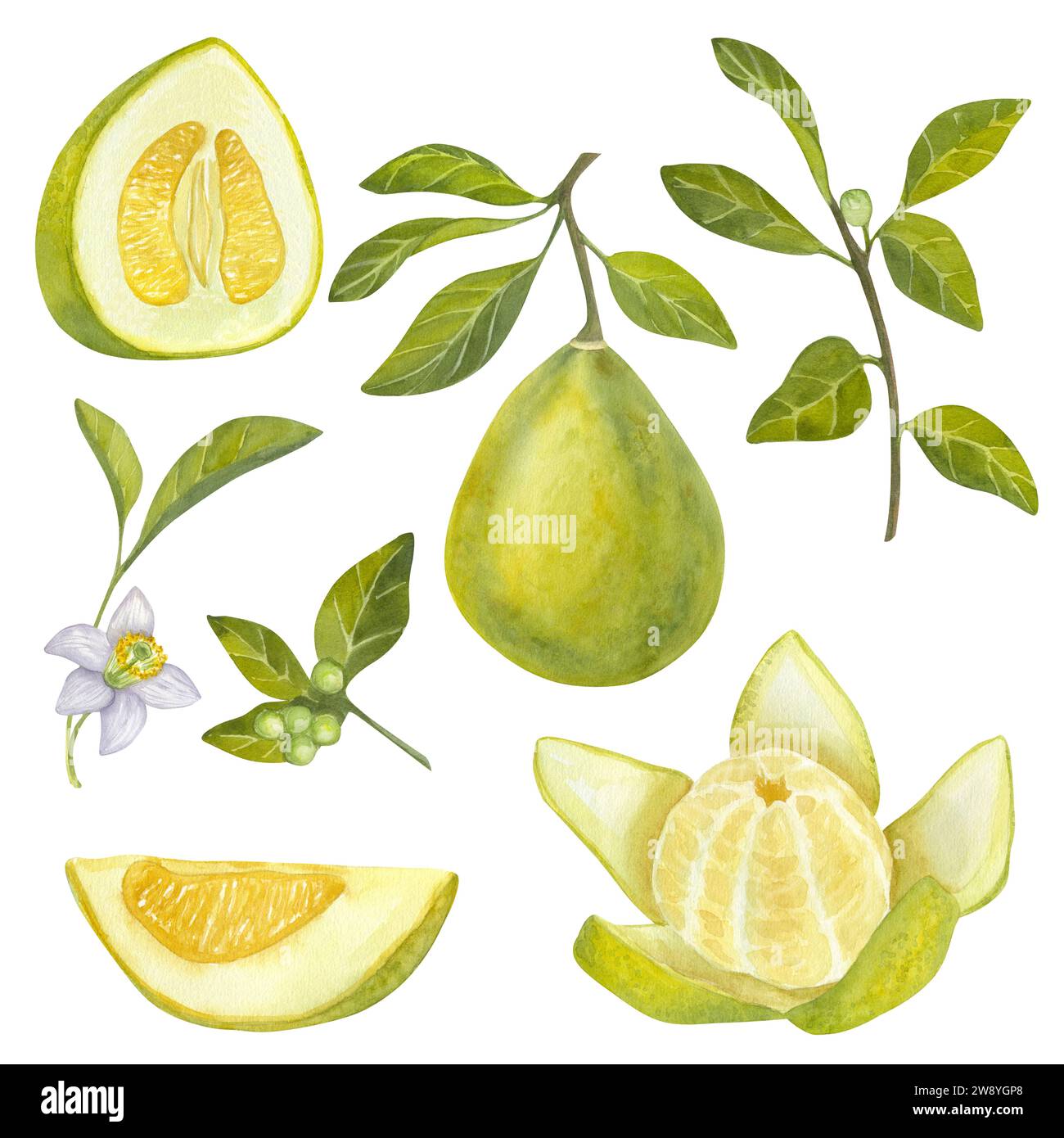 Pomelo citrus set Fresh yellow green fruit Thick peel and juicy pulp