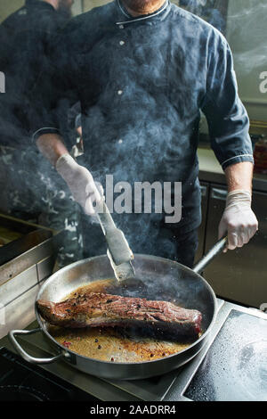Frying New York strip steak in cast iron frying pan over the electric