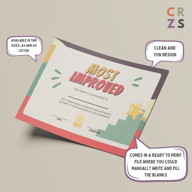 Improvement Award Certificate for Kids Classroom Award Certificate