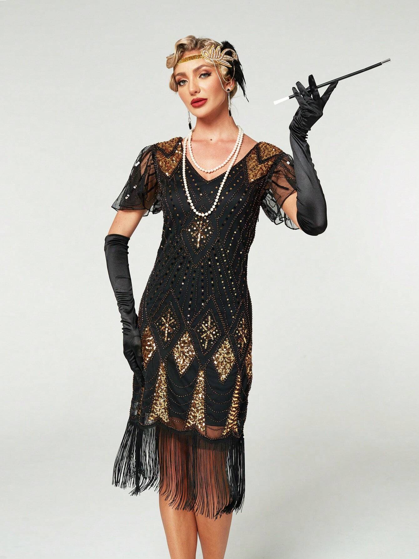 Women 1920s Plus V Neck Sequin Art Deco Flapper Dress with 20s Gatsby
