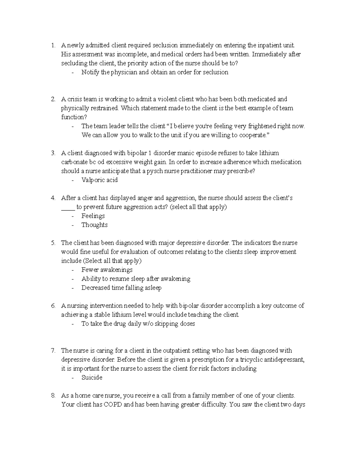 MH E3 Mental health exam 3 practice questions A newly admitted
