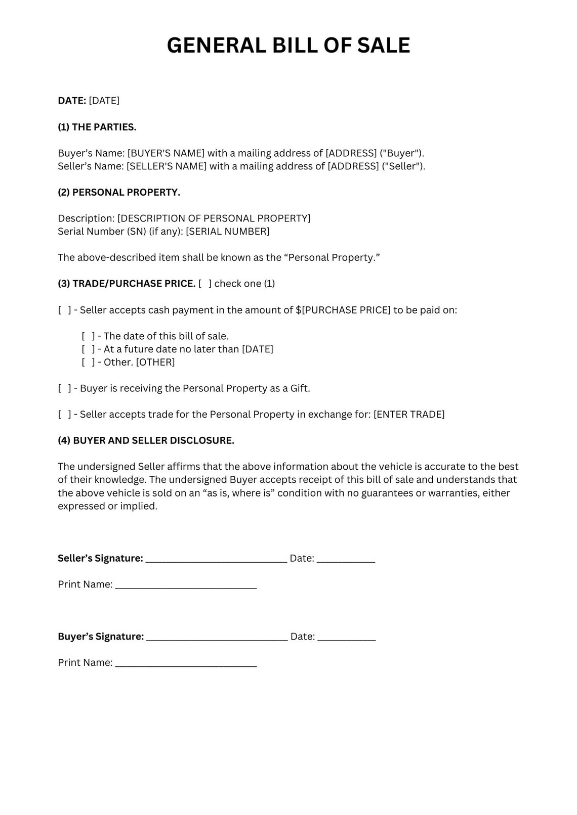 Free General Blank Bill of Sale PDF Template Word ( doc) Form PDF