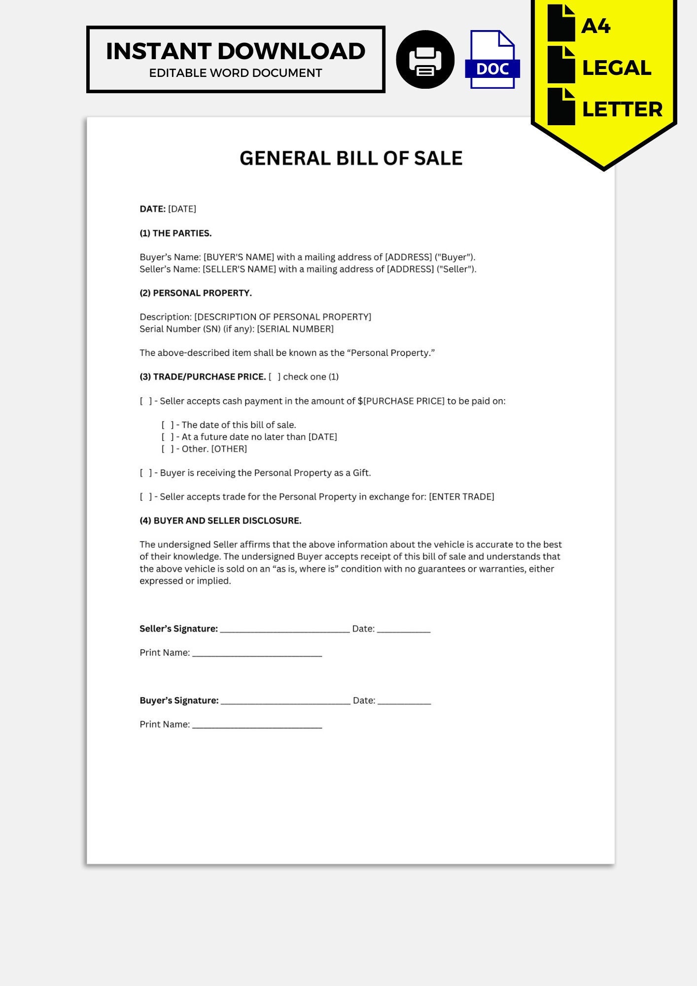 General Bill of Sale Template Editable PDF Word A4/US Letter Etsy
