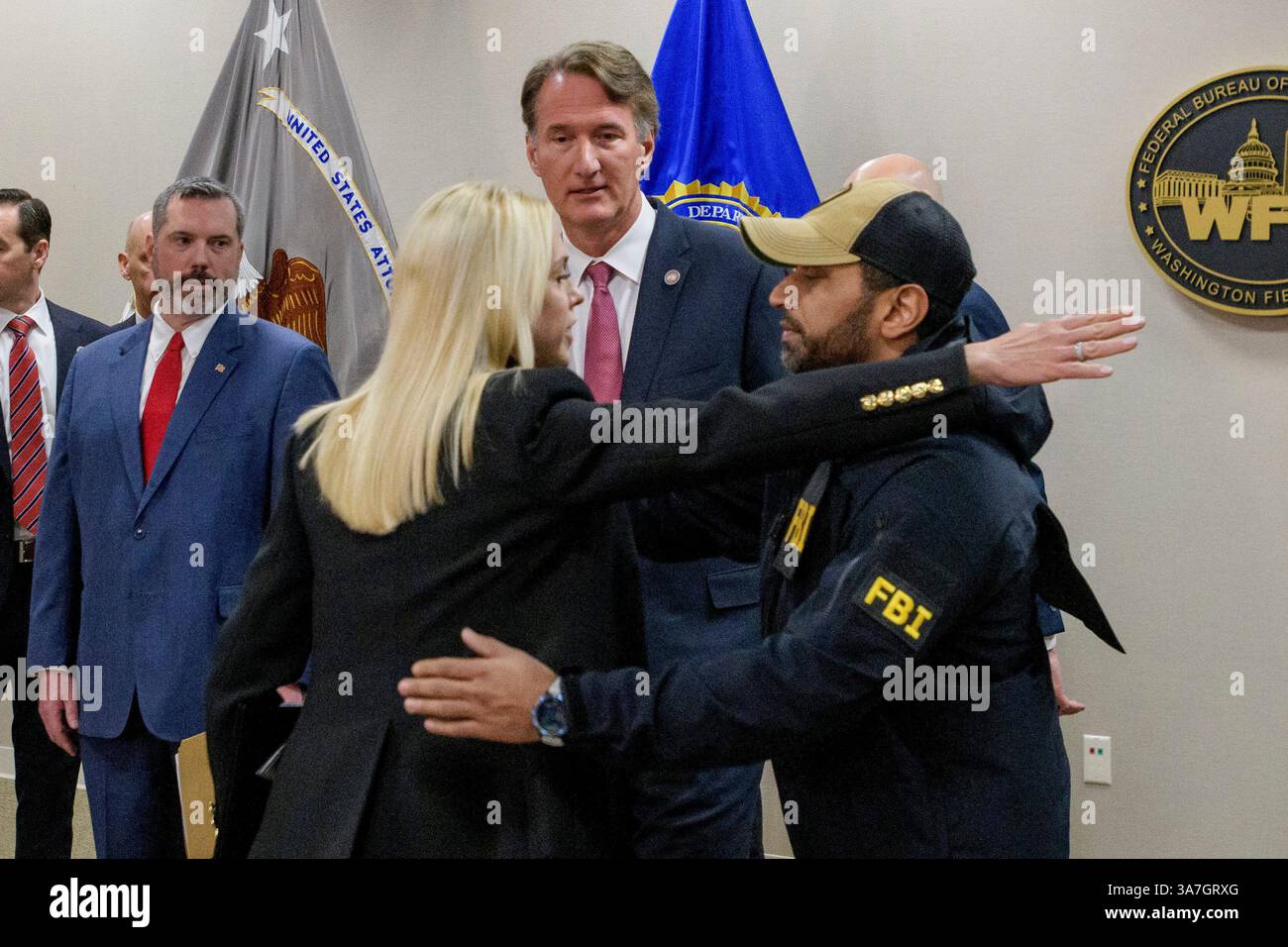 Attorney General Pam Bondi center left embraces FBI Director Kash