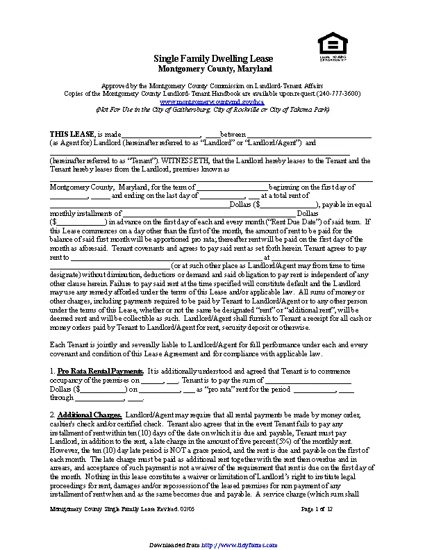 Free Maryland Single Family Dwelling Lease Form PDF 183KB 13 Page(s)