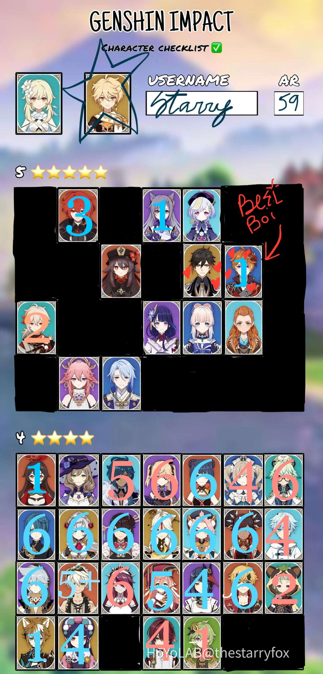 Genshin Impact Character Checklist 3 4 (Credit Template to Bobohizan
