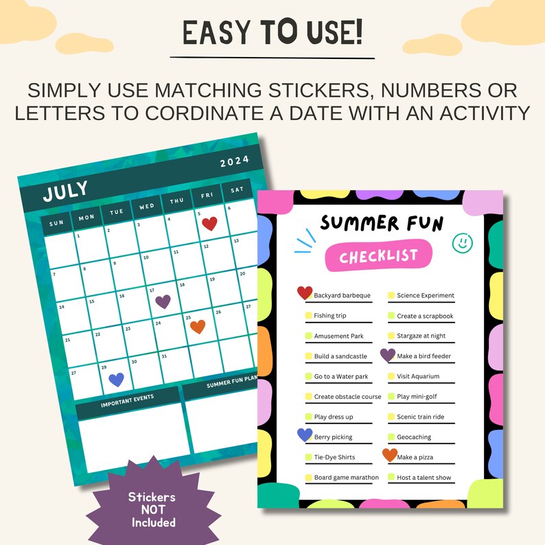 Summer Fun Checklist Kids Activity Charts July and August Calendars